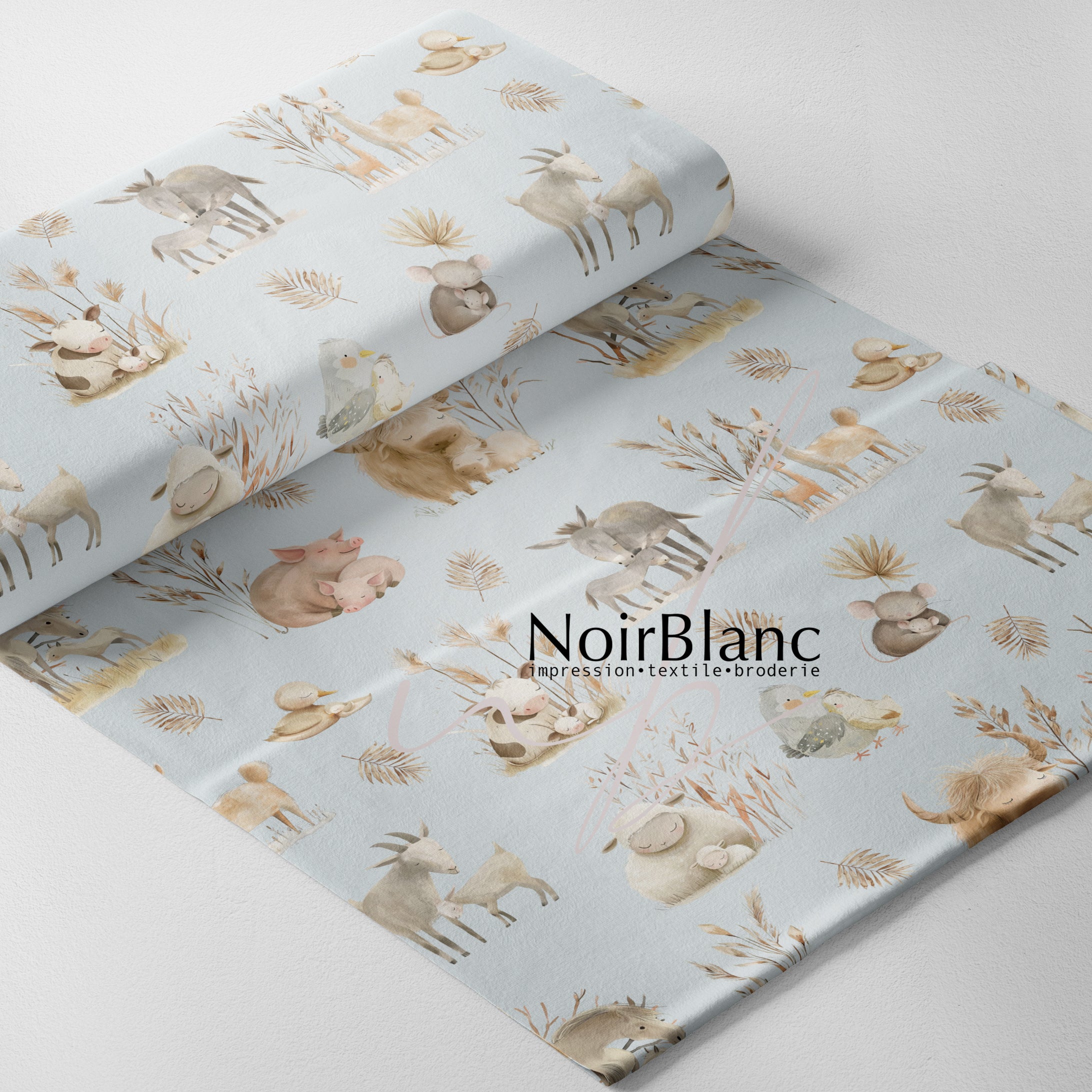 Maman et bébé à la ferme fond bleu