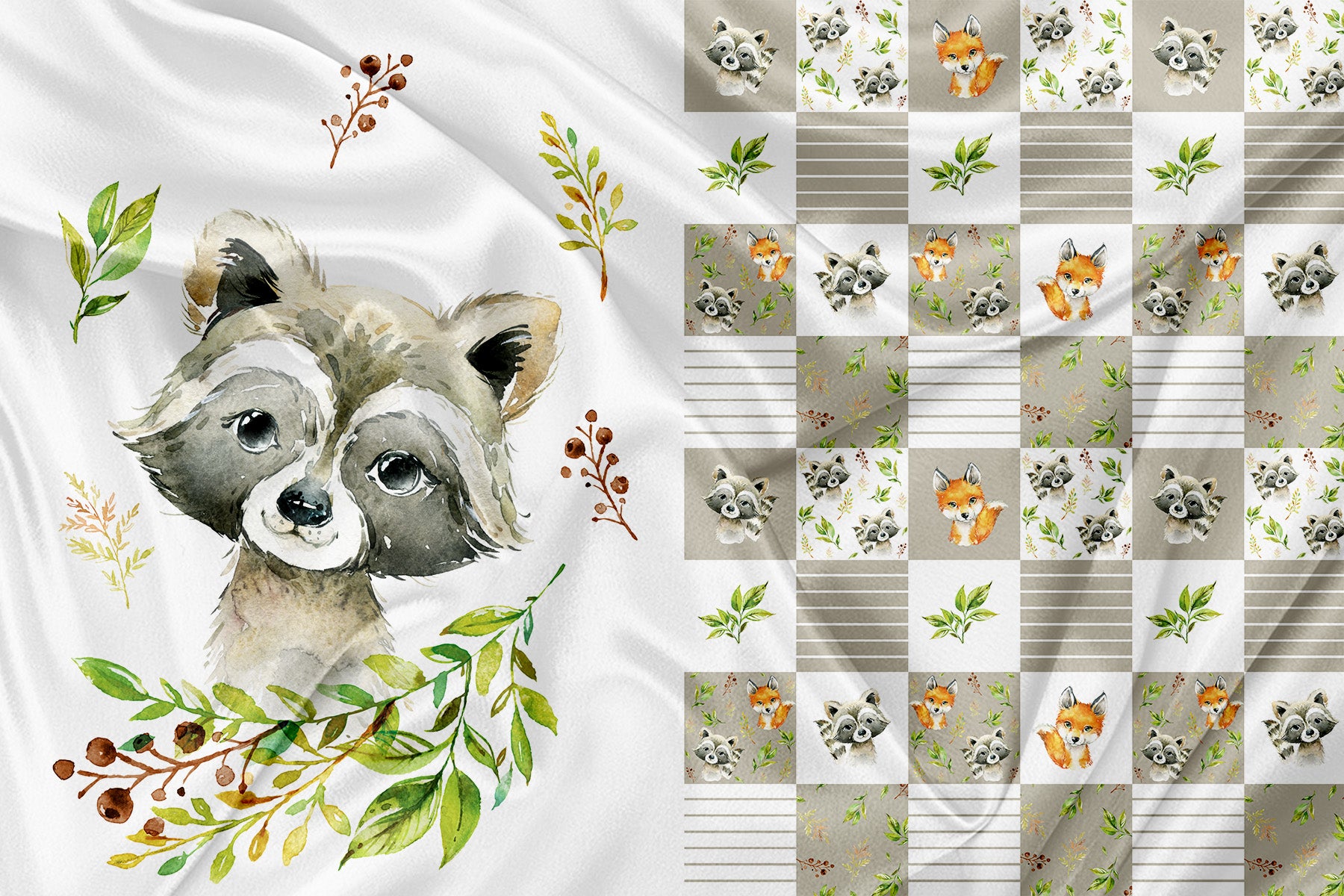 Panel for Garment and Blanket Raccoon and Patchwork